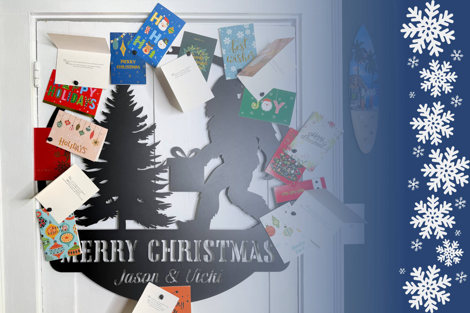 Your Christmas cards deserve more than your fridge. Display them with a personalized metal display that is easy to hang - just add small, simple magnets. These displays double for wall or door decor during the holidays and are cut from durable weatherproof steel to last year after year indoors or out.