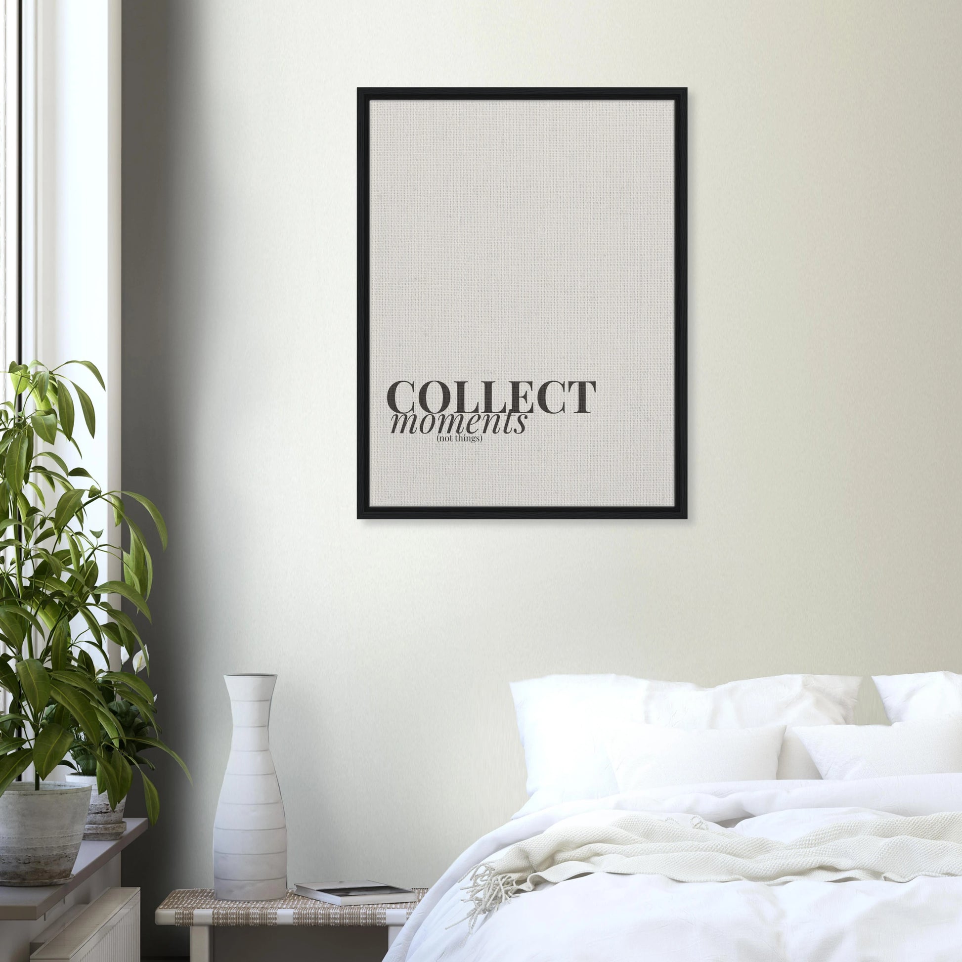 The Collect Moments canvas is a quiet nudge toward experiences over possessions — a mindset rooted in travel, connection, and memory-making. With classic typography and soft neutral tones, this piece feels calm, intentional, and effortlessly timeless.